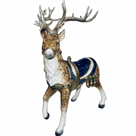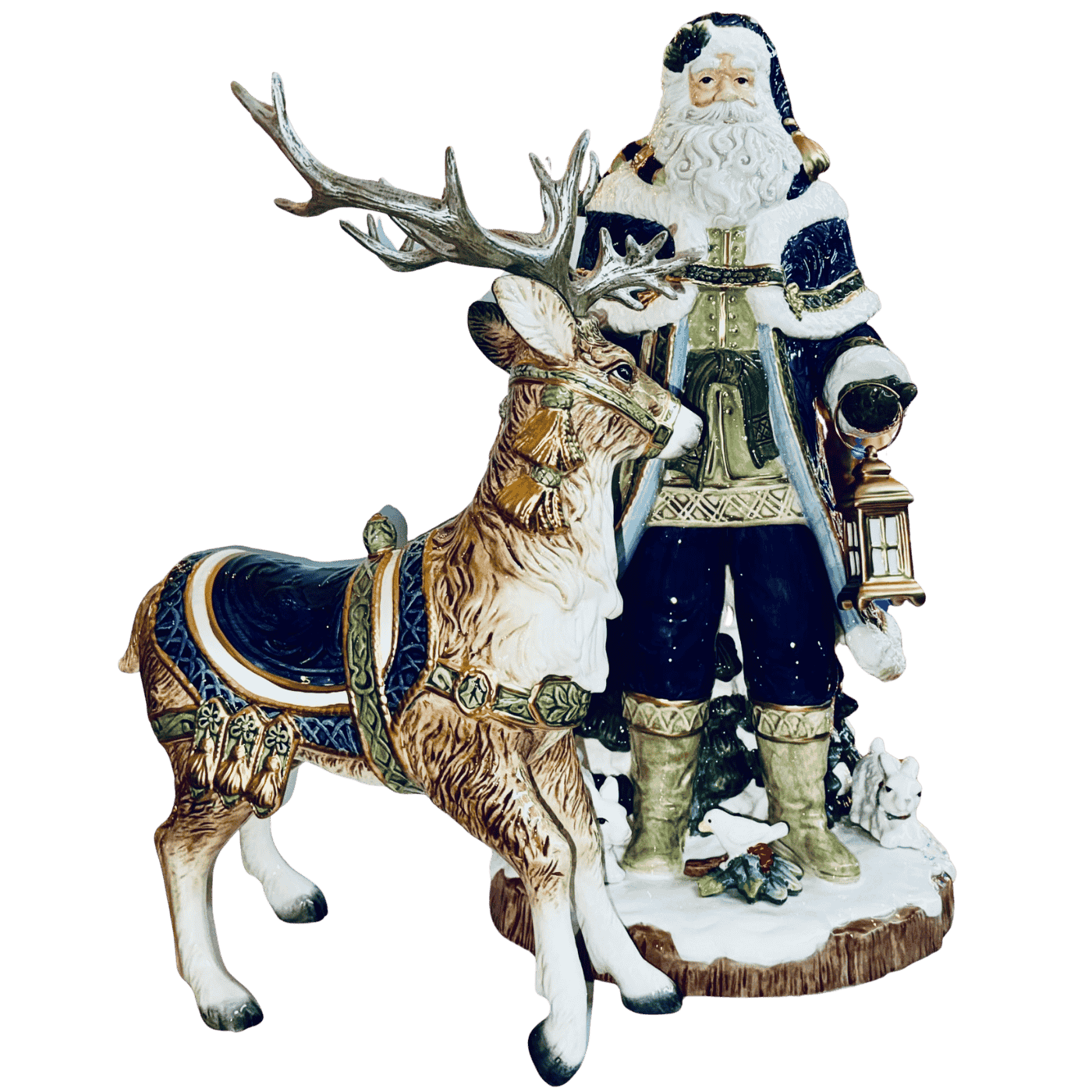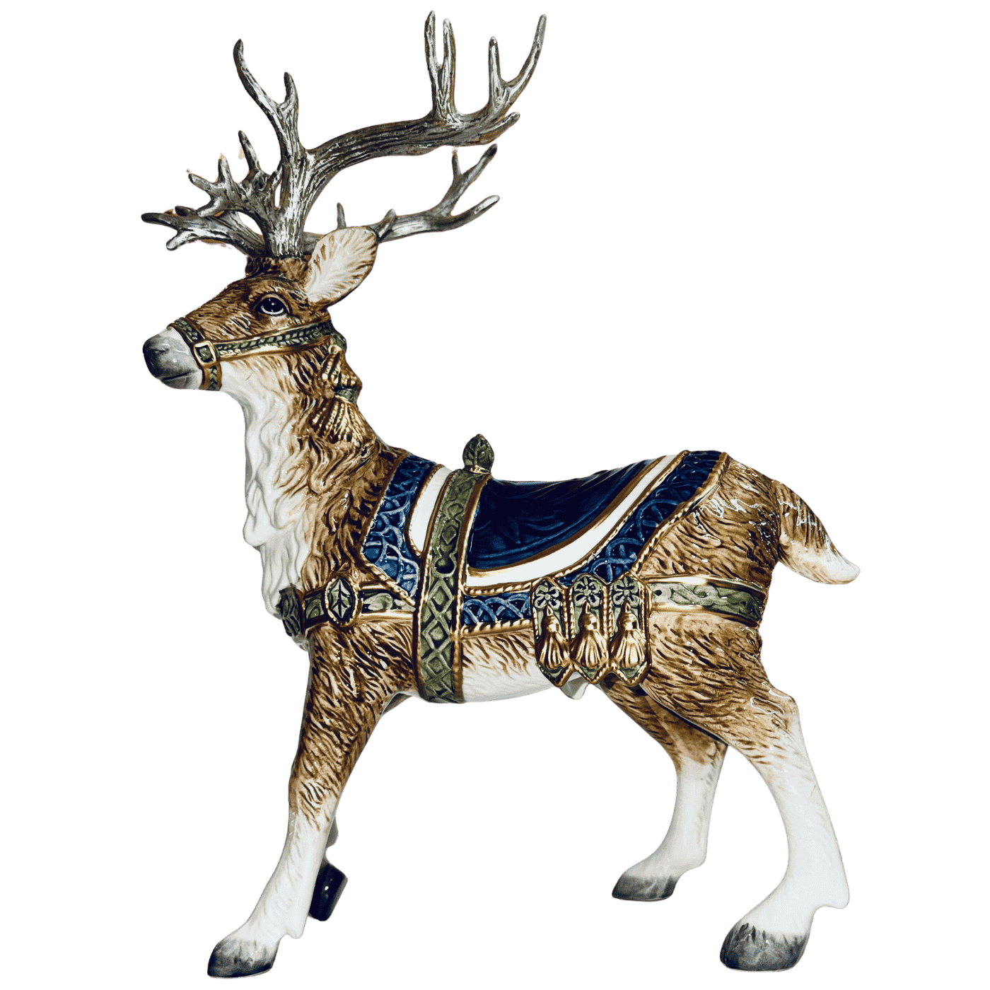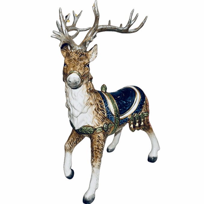 La figura, alta circa 40 cm, presenta una renna slanciata e maestosa, impreziosita da una finitura blu profonda, arricchita da motivi decorativi dorati e bianchi che donano luminosità e un’eleganza senza tempo. Le superfici smaltate e le applicazioni ornamentali mettono in risalto la lavorazione artigianale, rendendo ogni pezzo unico.