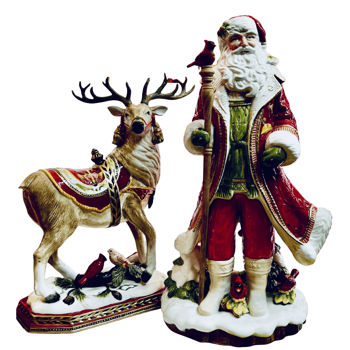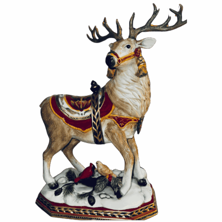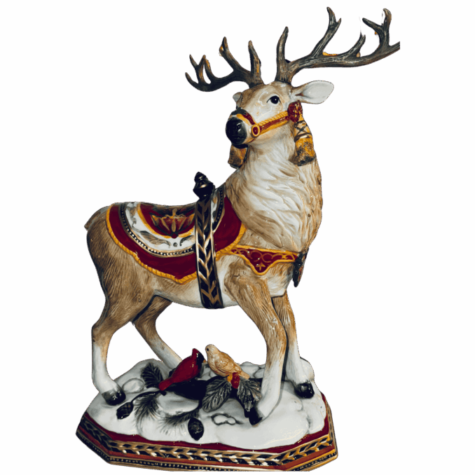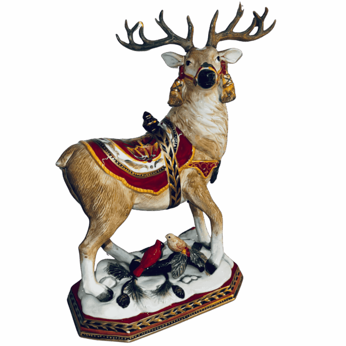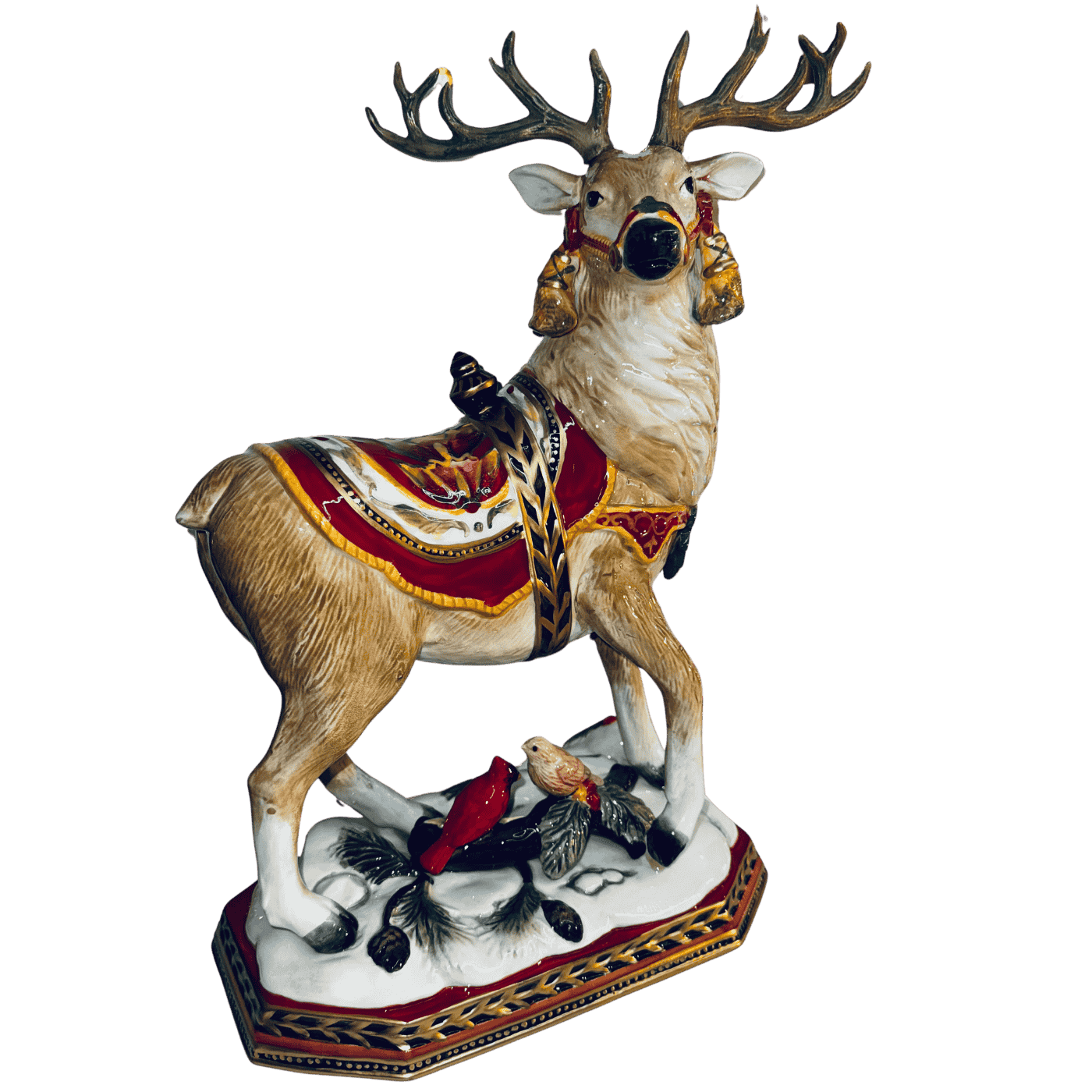 Renna in fine porcellana, color beige e rosso, impreziosita da una sella rossa in rilievo e da piccoli uccellini rossi e bianchi. Decorata con cura nei dettagli, è un complemento raffinato ideale per arricchire l’arredamento della casa durante il periodo natalizio.