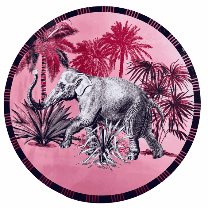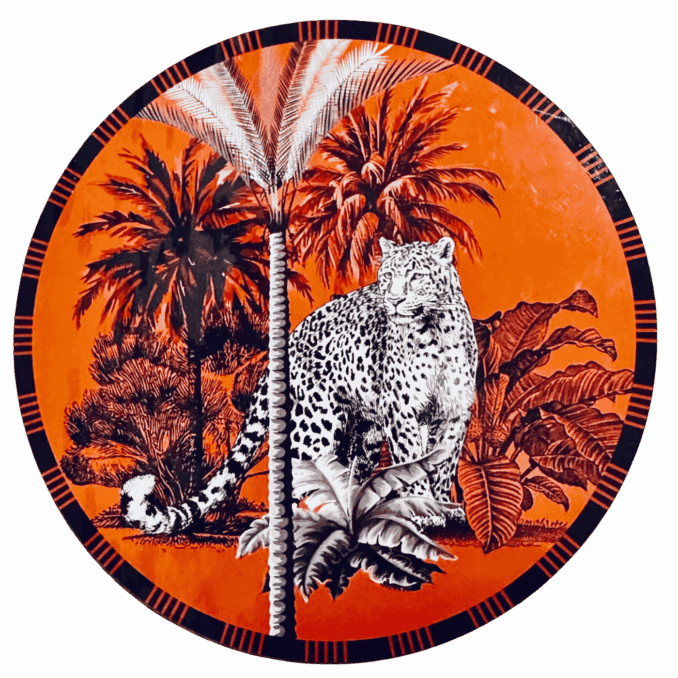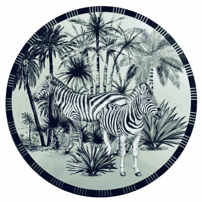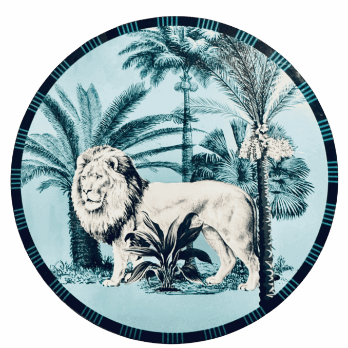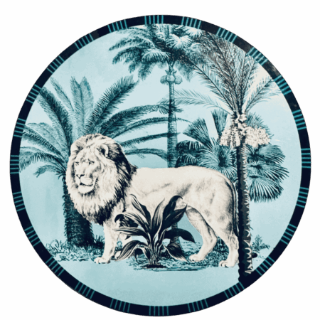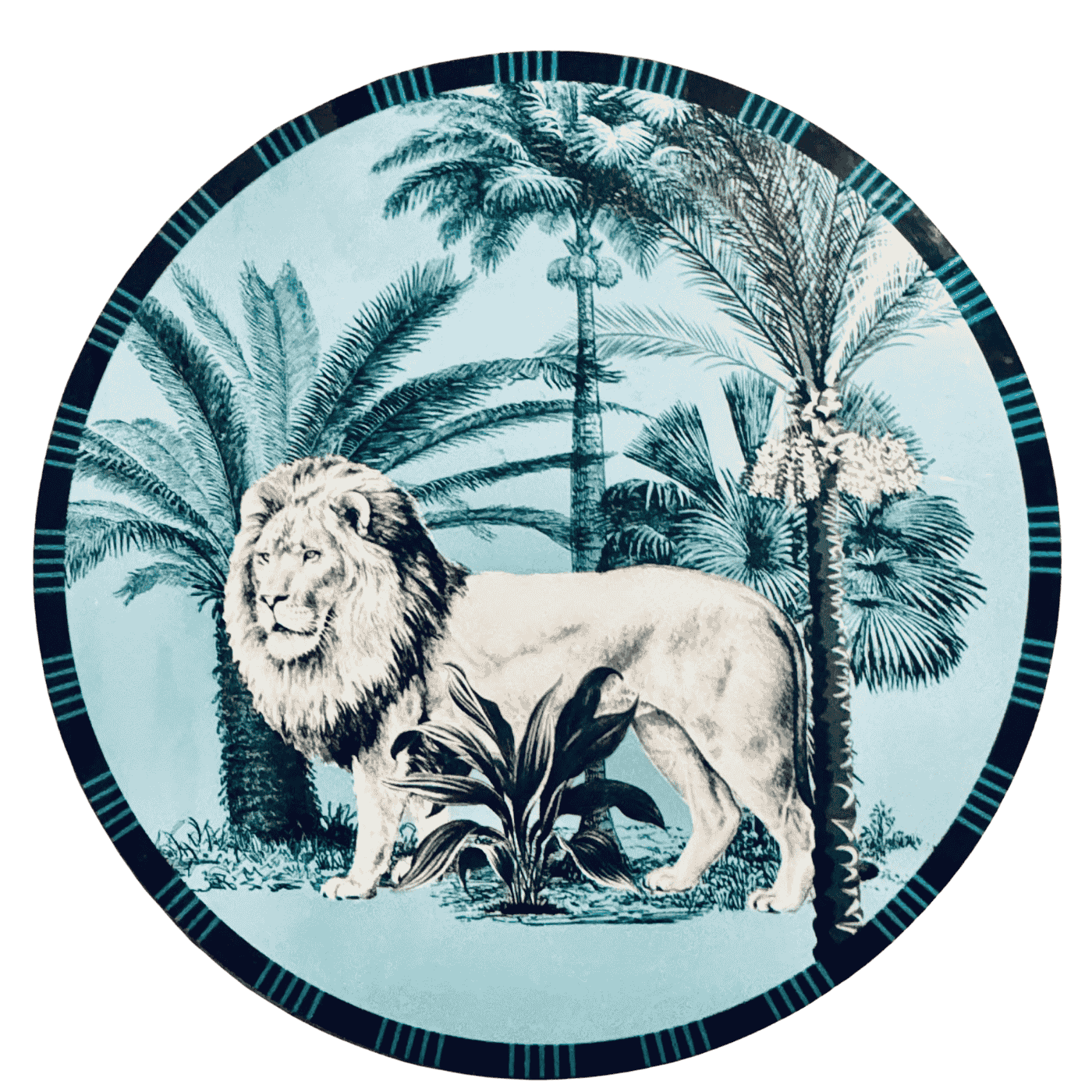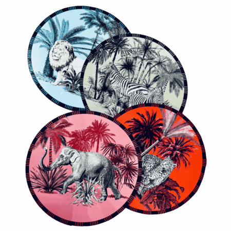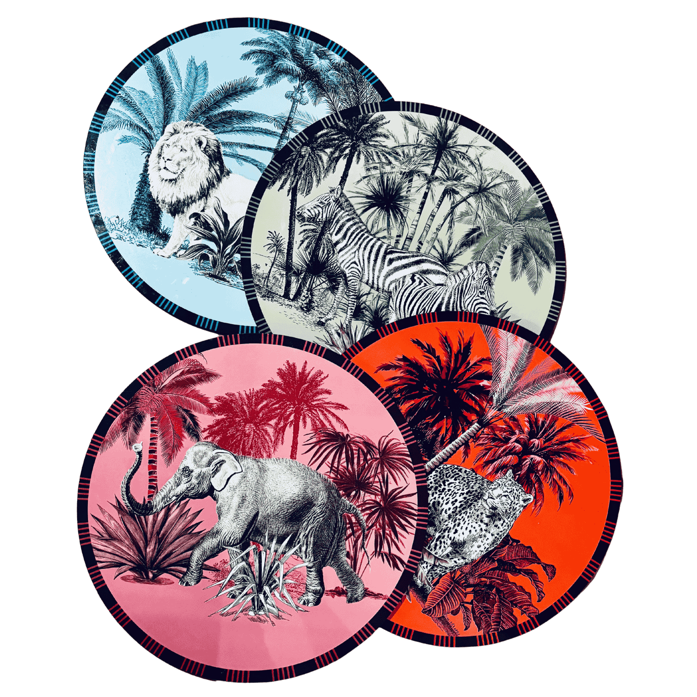 Quattro sottopiatti eleganti in plexiglass stampato con decori animalier (leone, leopardo, zebra, elefante) montati su un supporto in foglio di sughero. Design raffinato che unisce brillantezza e praticità: proteggono la tavola, donano carattere e rendono ogni mise en place sofisticata.