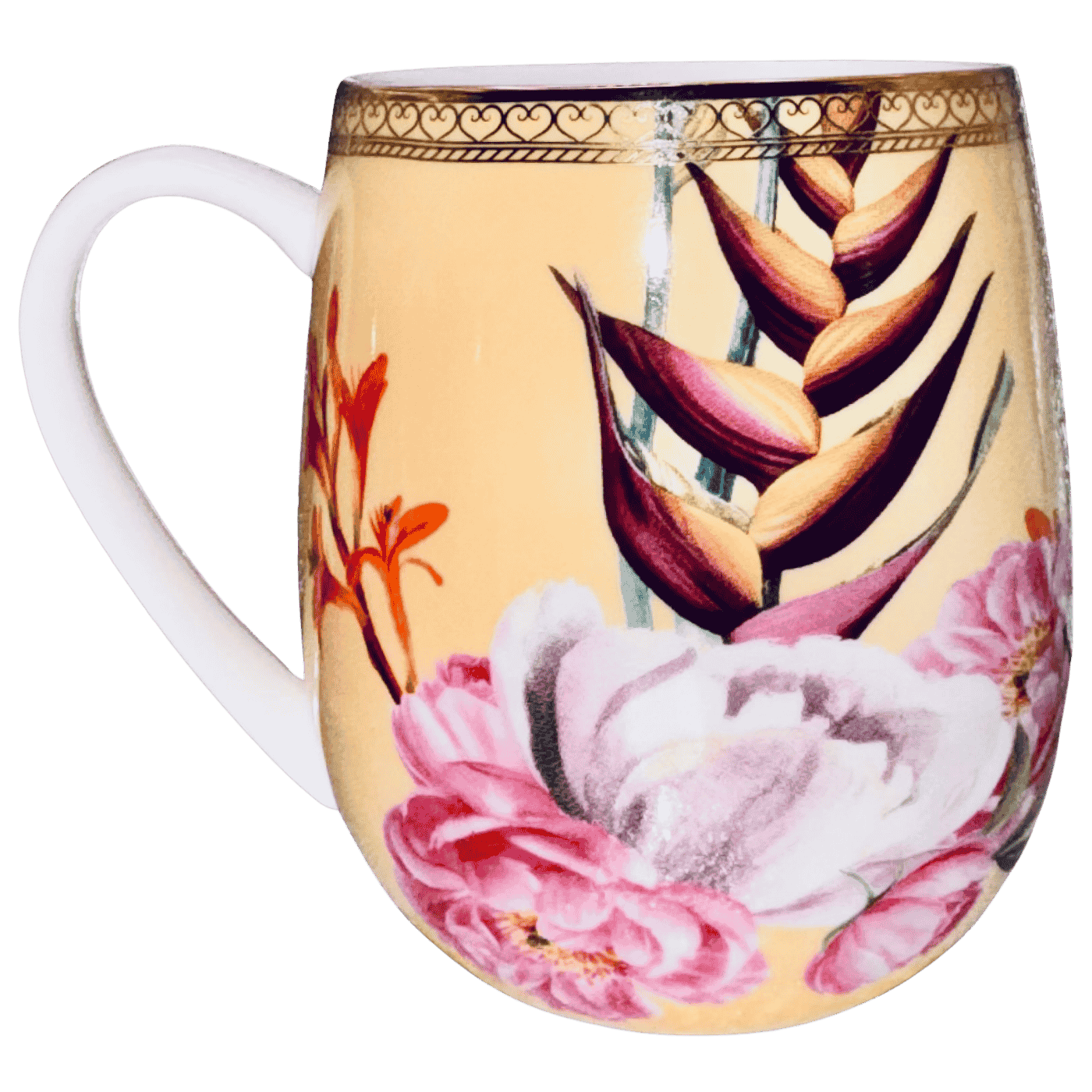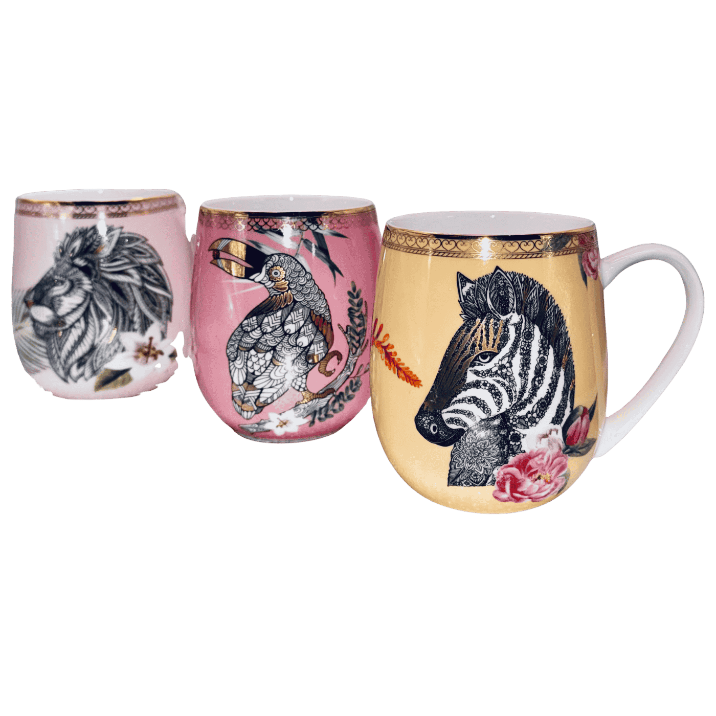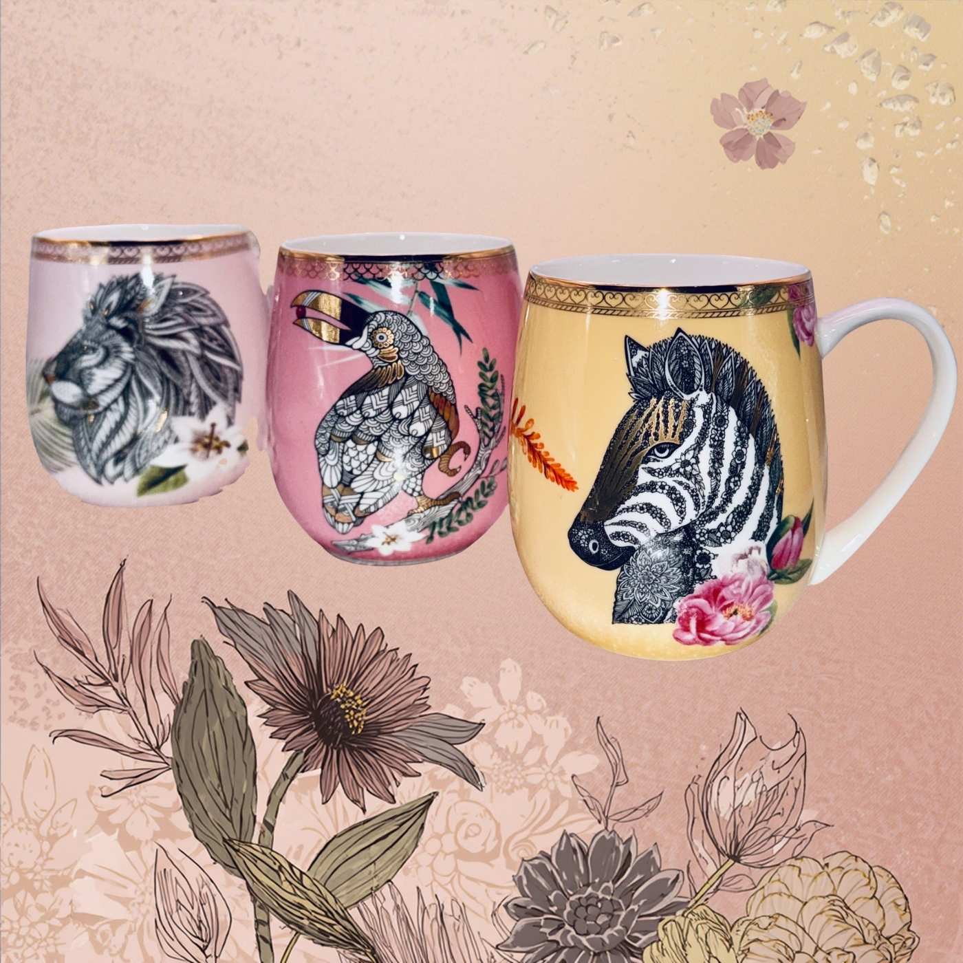 La stampa ad alta definizione valorizza i dettagli dell’animale e delle foglie tropicali, creando un effetto decorativo ricercato. Molte mug di questo tipo fanno parte di collezioni animalier in porcellana New Bone China, spesso arricchite da elementi floreali o dettagli dorati.