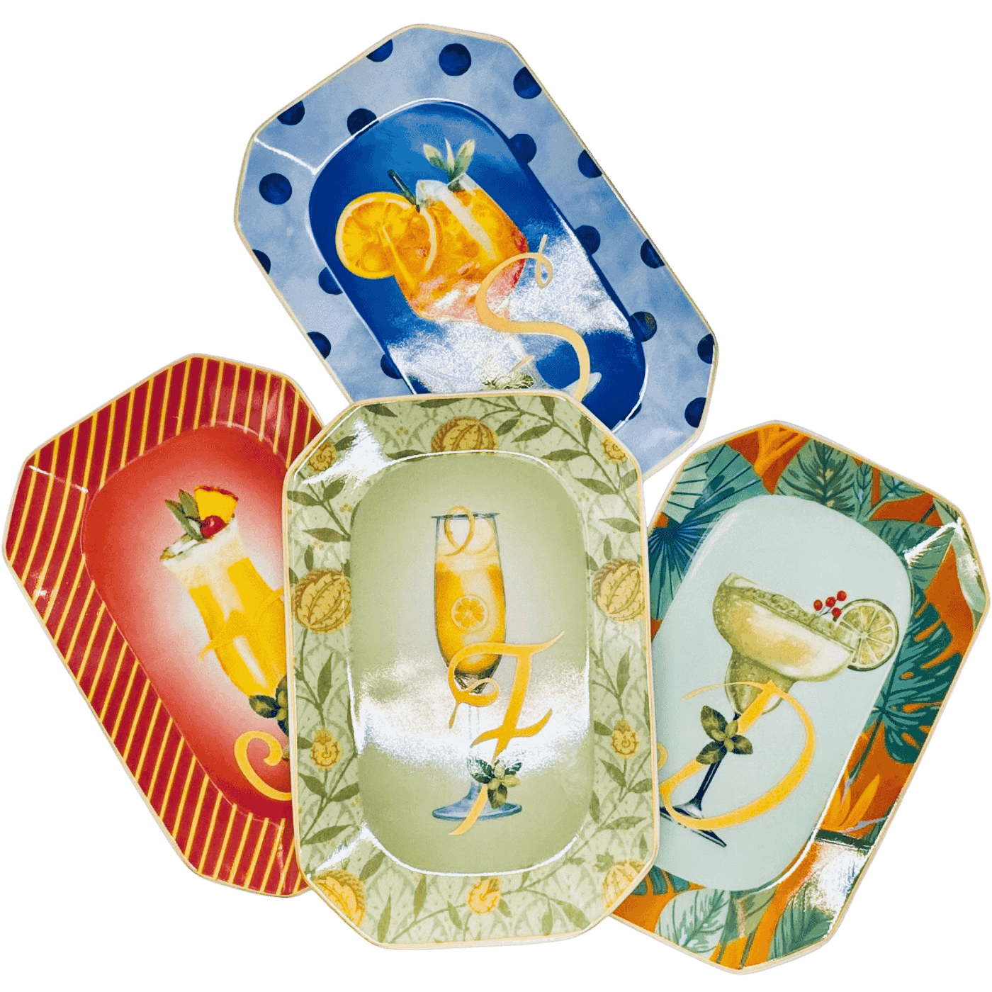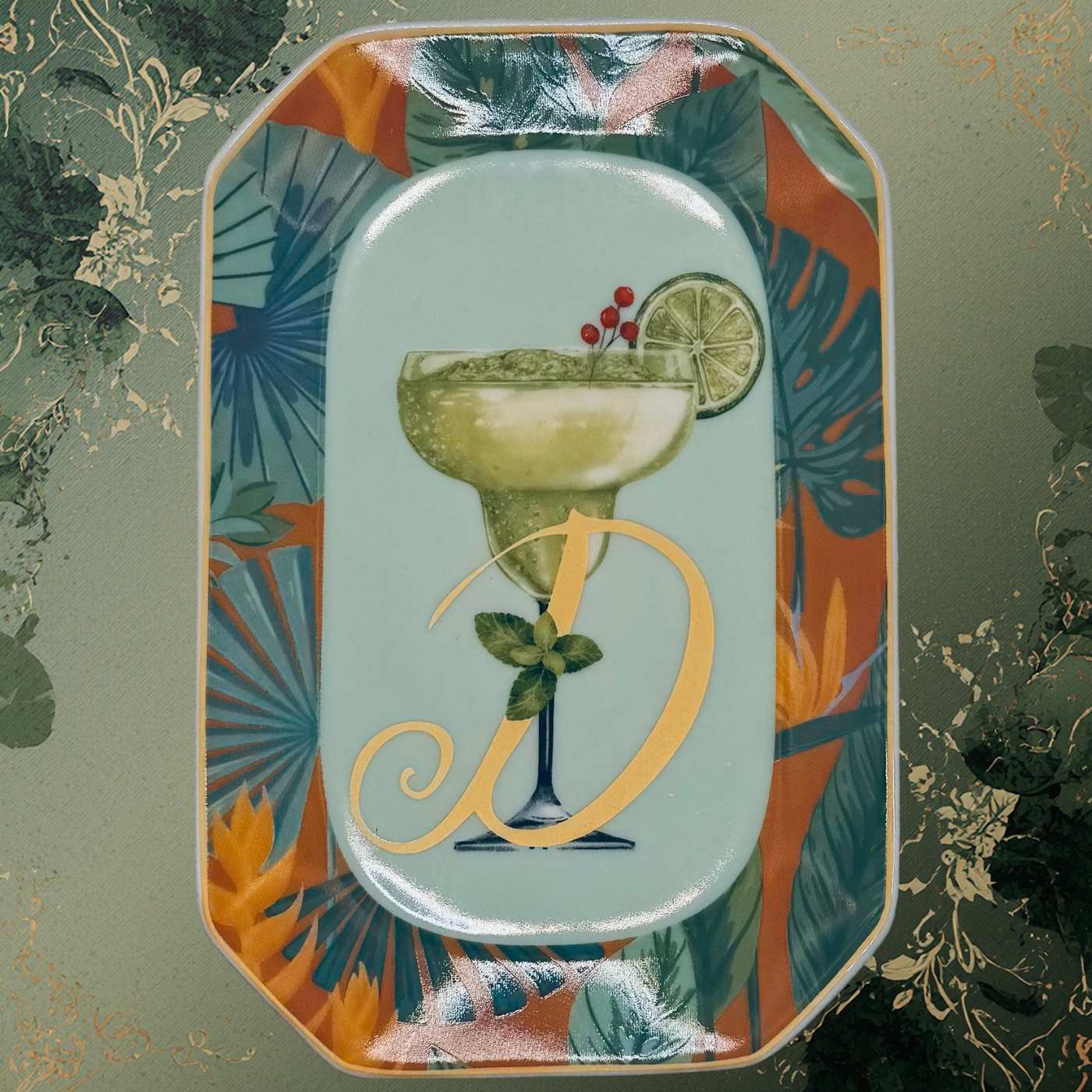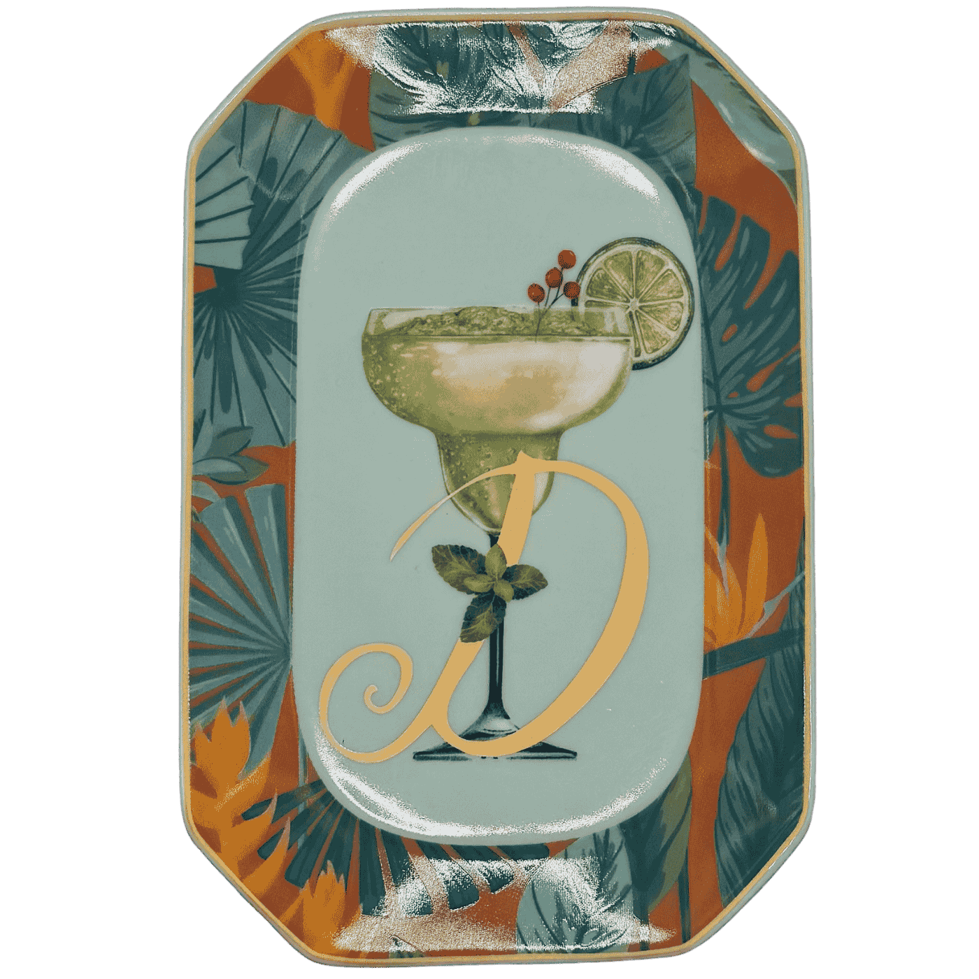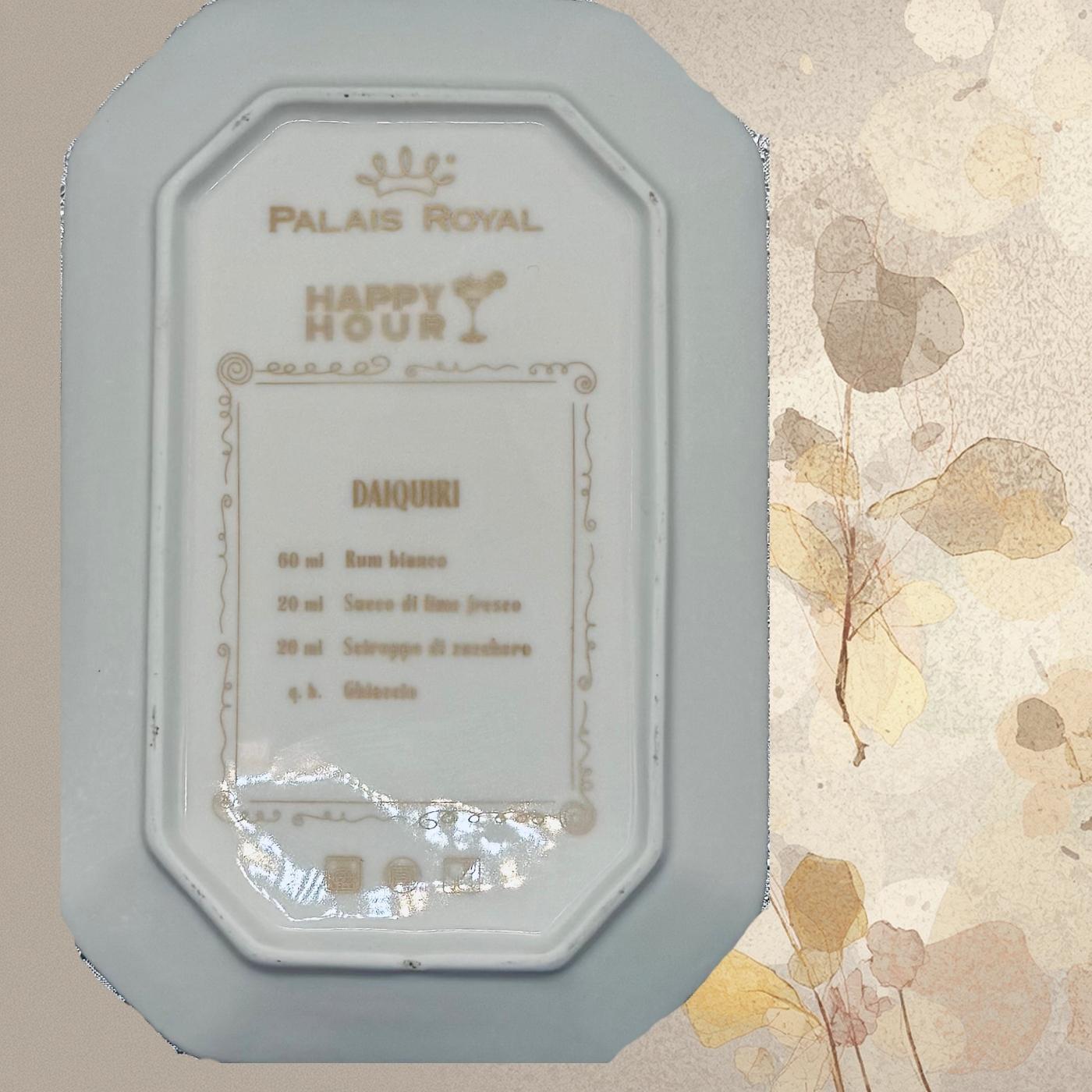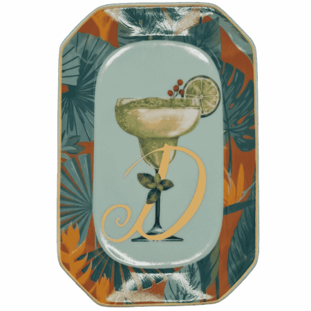 Vassoietto della linea “Happy Hour” con iniziale D, realizzato in porcellana. Sul lato frontale è stampata l’illustrazione di un cocktail, mentre sul retro è riportata la relativa ricetta, rendendolo un oggetto originale e decorativo.