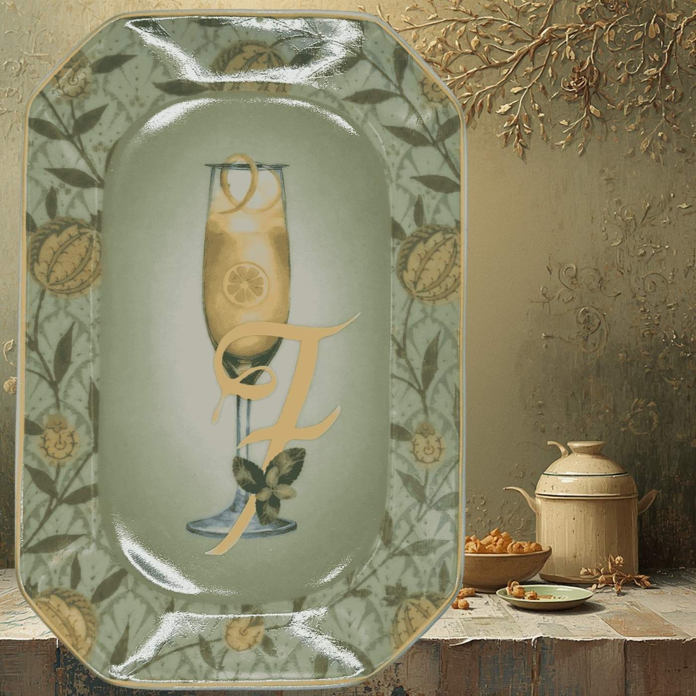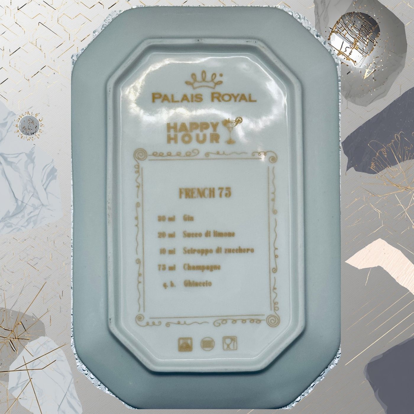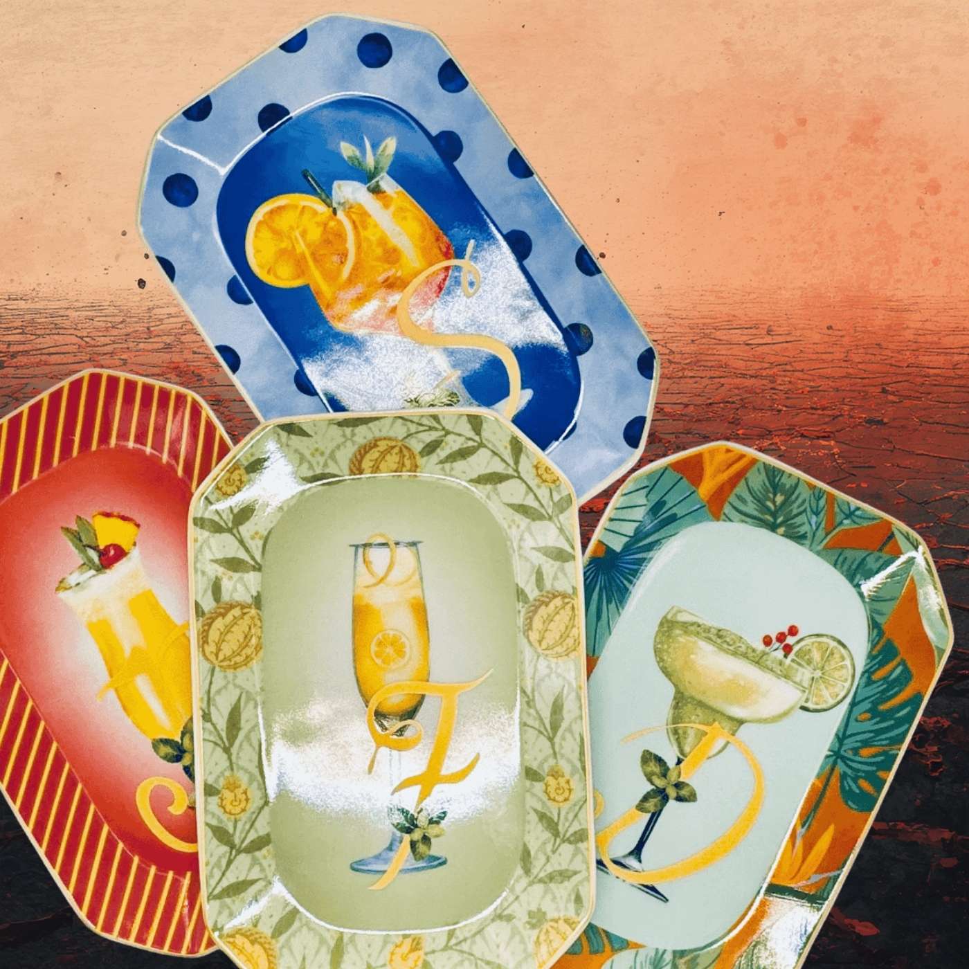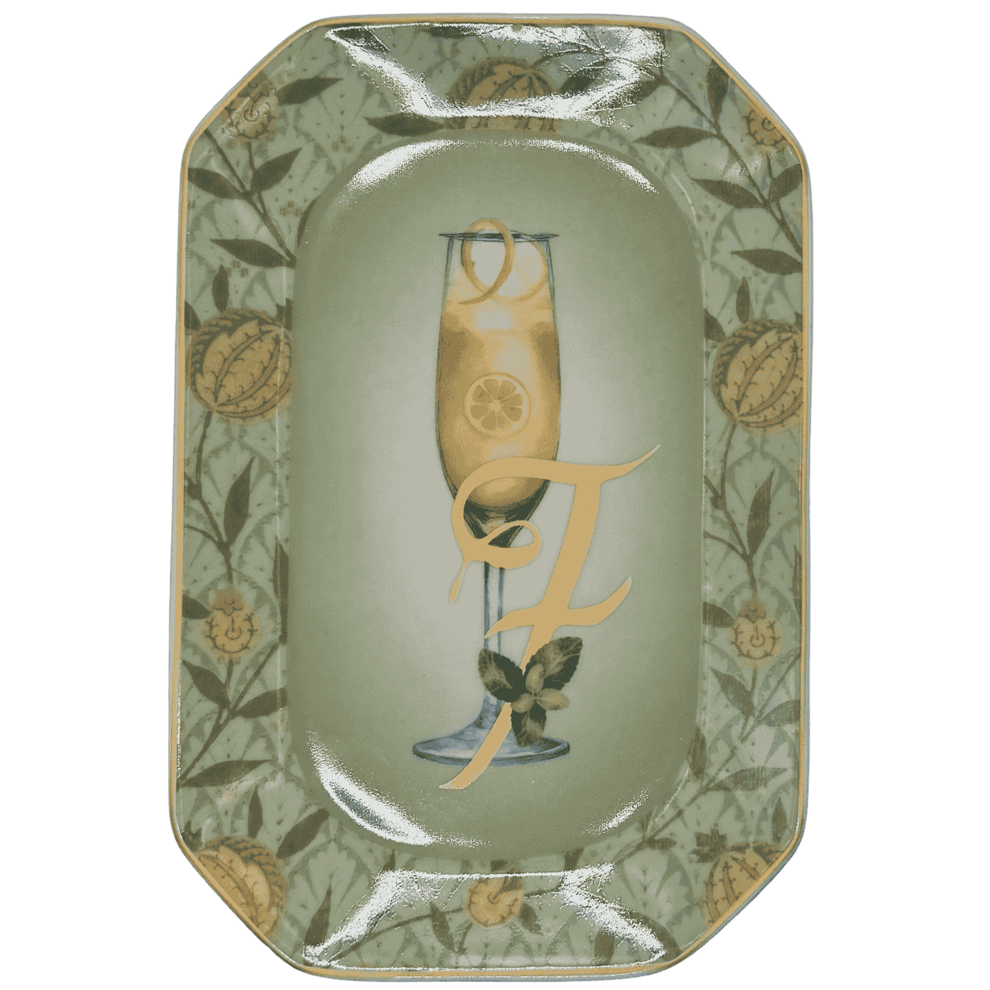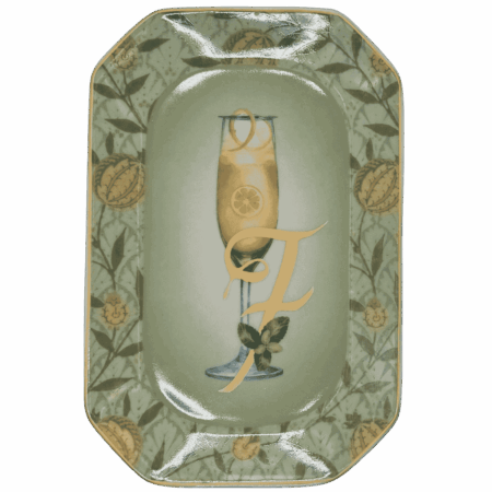 Vassoietto della linea “Happy Hour” con iniziale F, realizzato in porcellana. Sul lato frontale è stampata l’illustrazione di un cocktail, mentre sul retro è riportata la relativa ricetta, rendendolo un oggetto originale e decorativo.