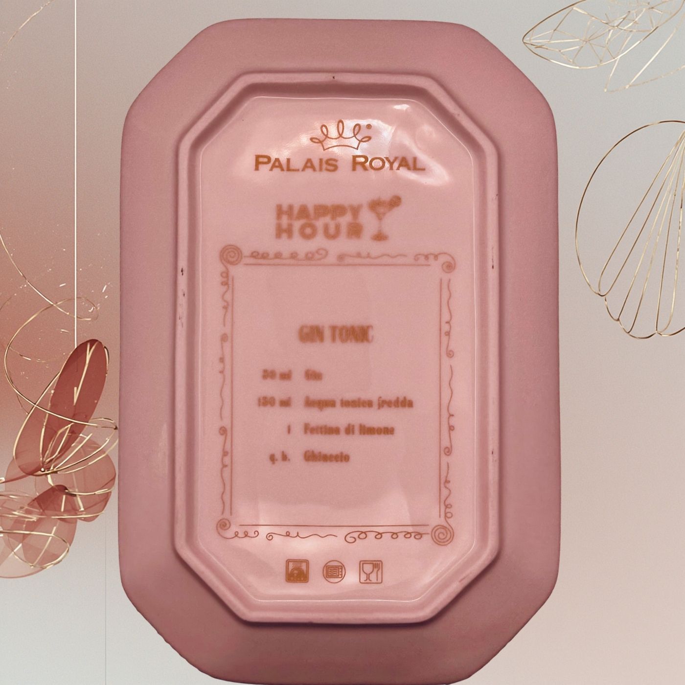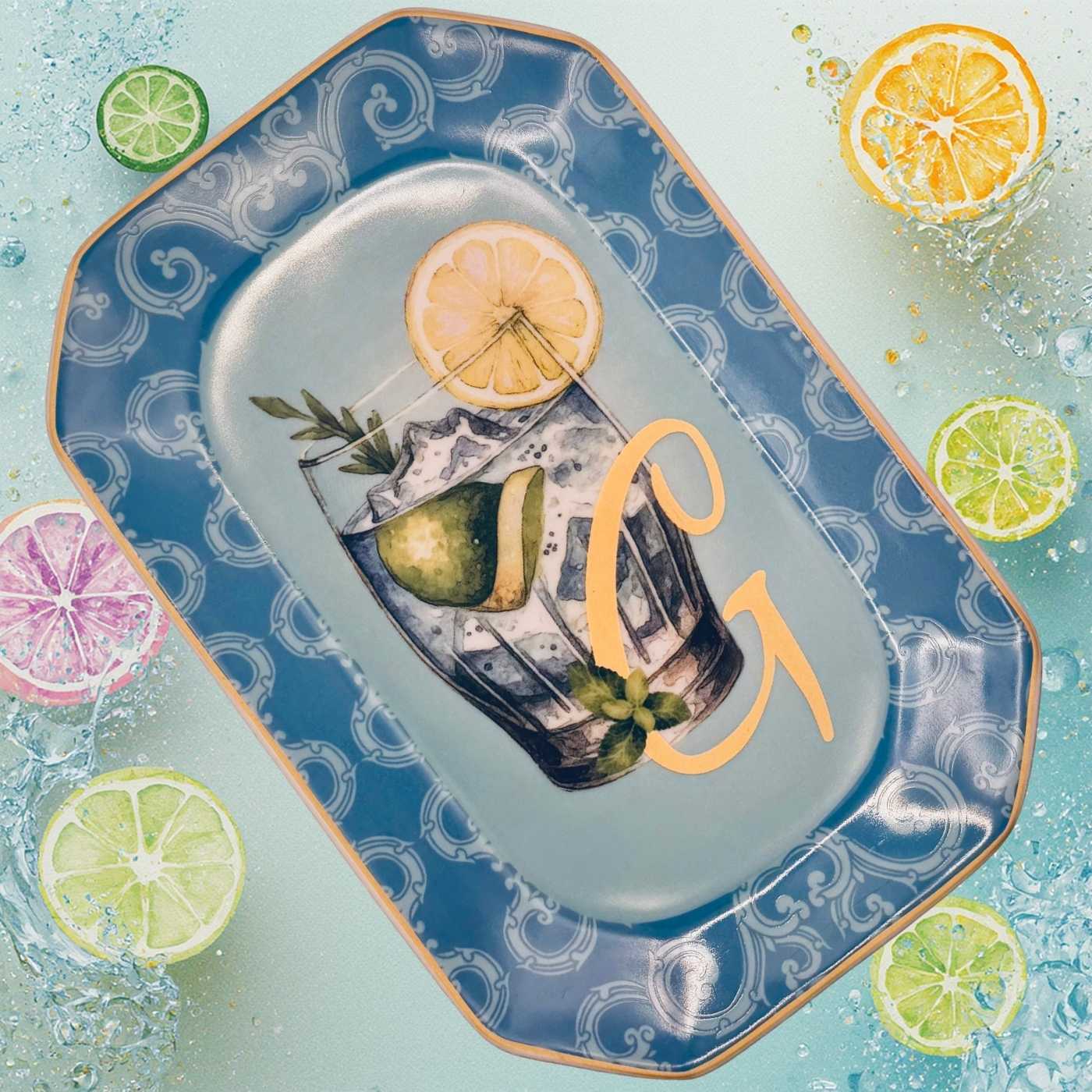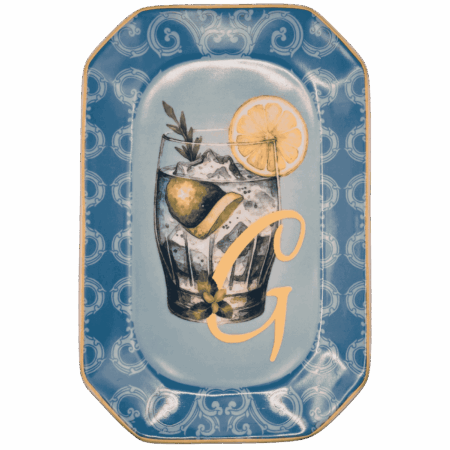 Vassoietto della linea “Happy Hour” con iniziale G, realizzato in porcellana. Sul lato frontale è stampata l’illustrazione di un cocktail, mentre sul retro è riportata la relativa ricetta, rendendolo un oggetto originale e decorativo.