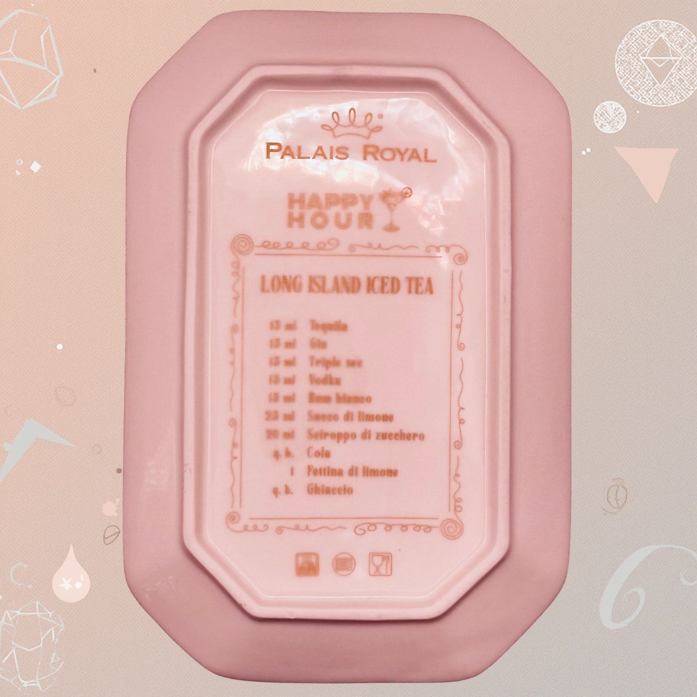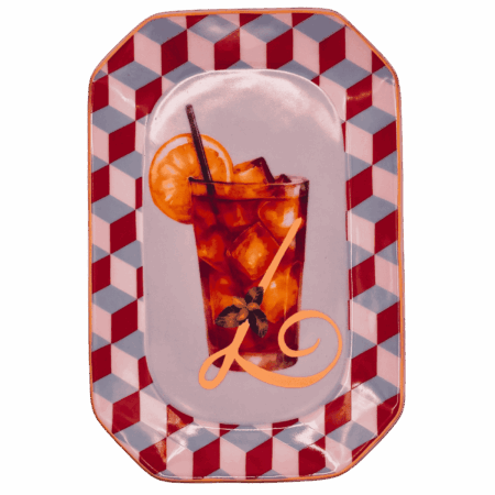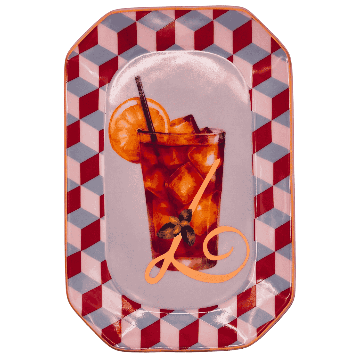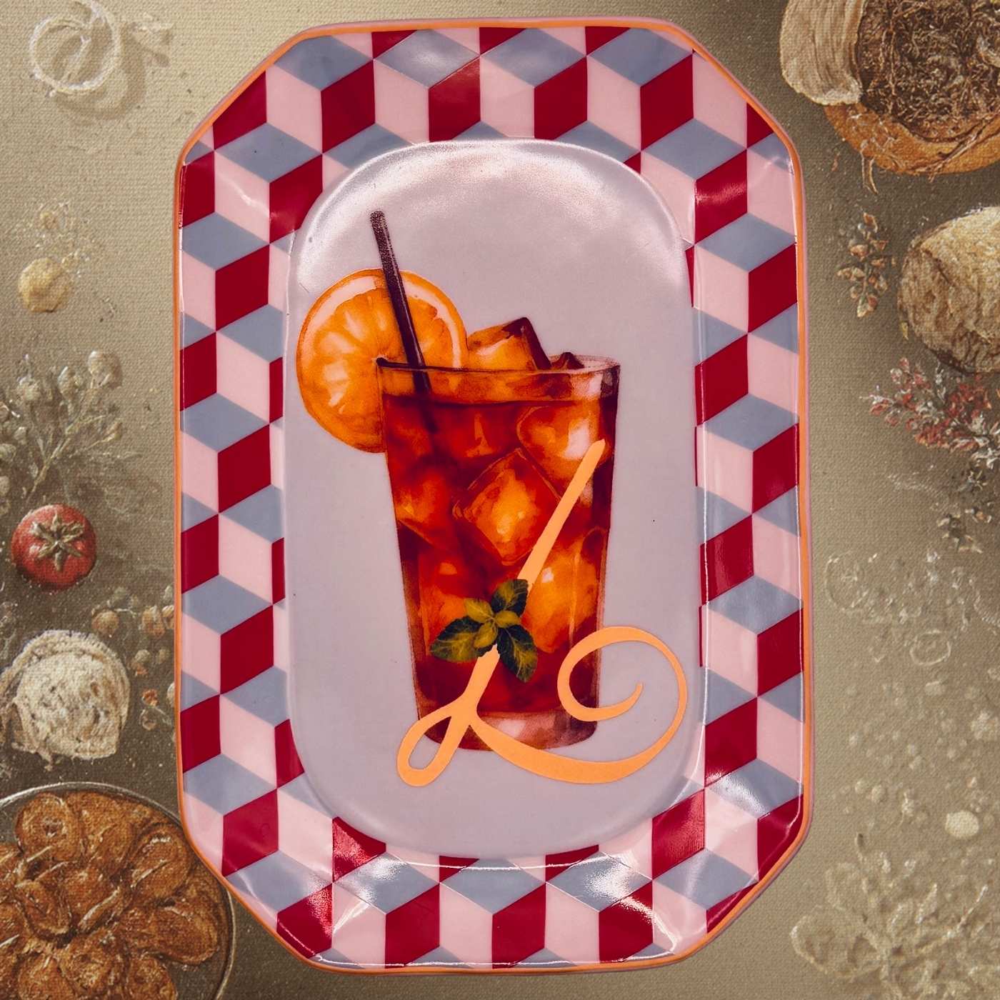 Vassoietto della linea “Happy Hour” con iniziale L, realizzato in porcellana. Sul lato frontale è stampata l’illustrazione di un cocktail, mentre sul retro è riportata la relativa ricetta, rendendolo un oggetto originale e decorativo.