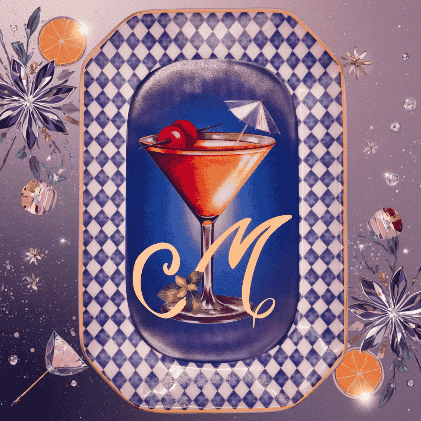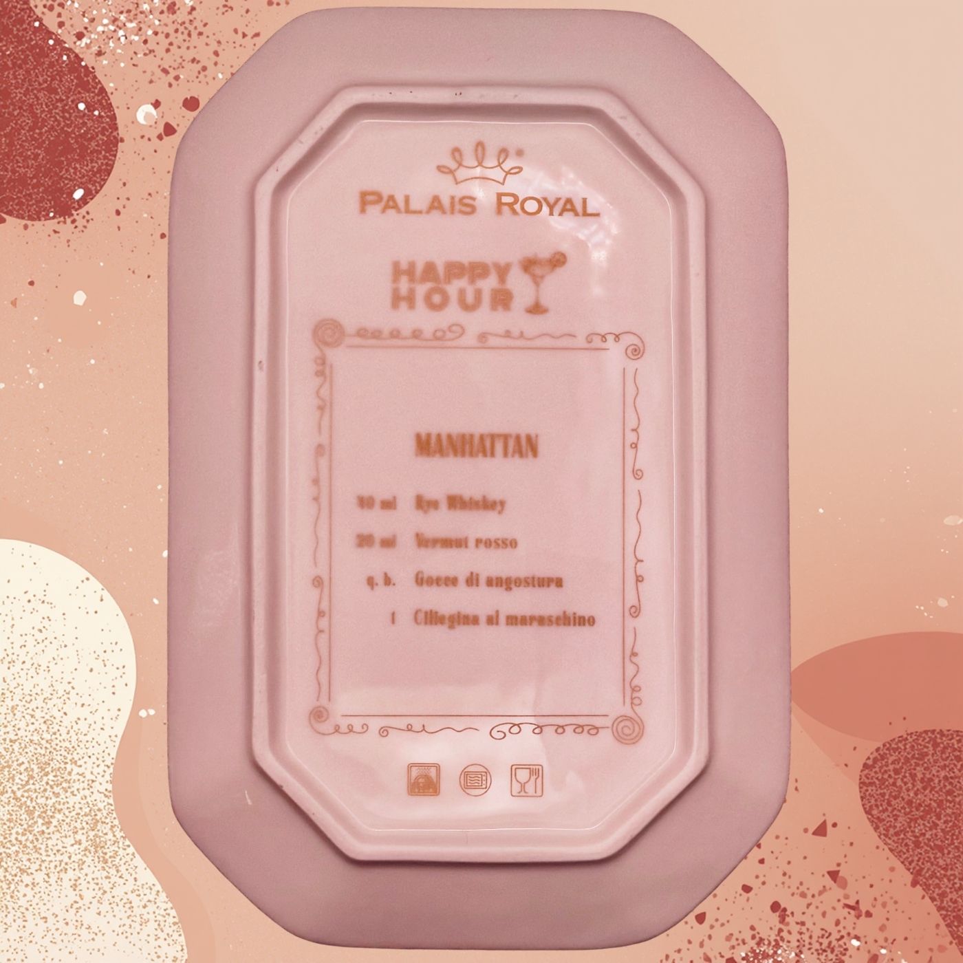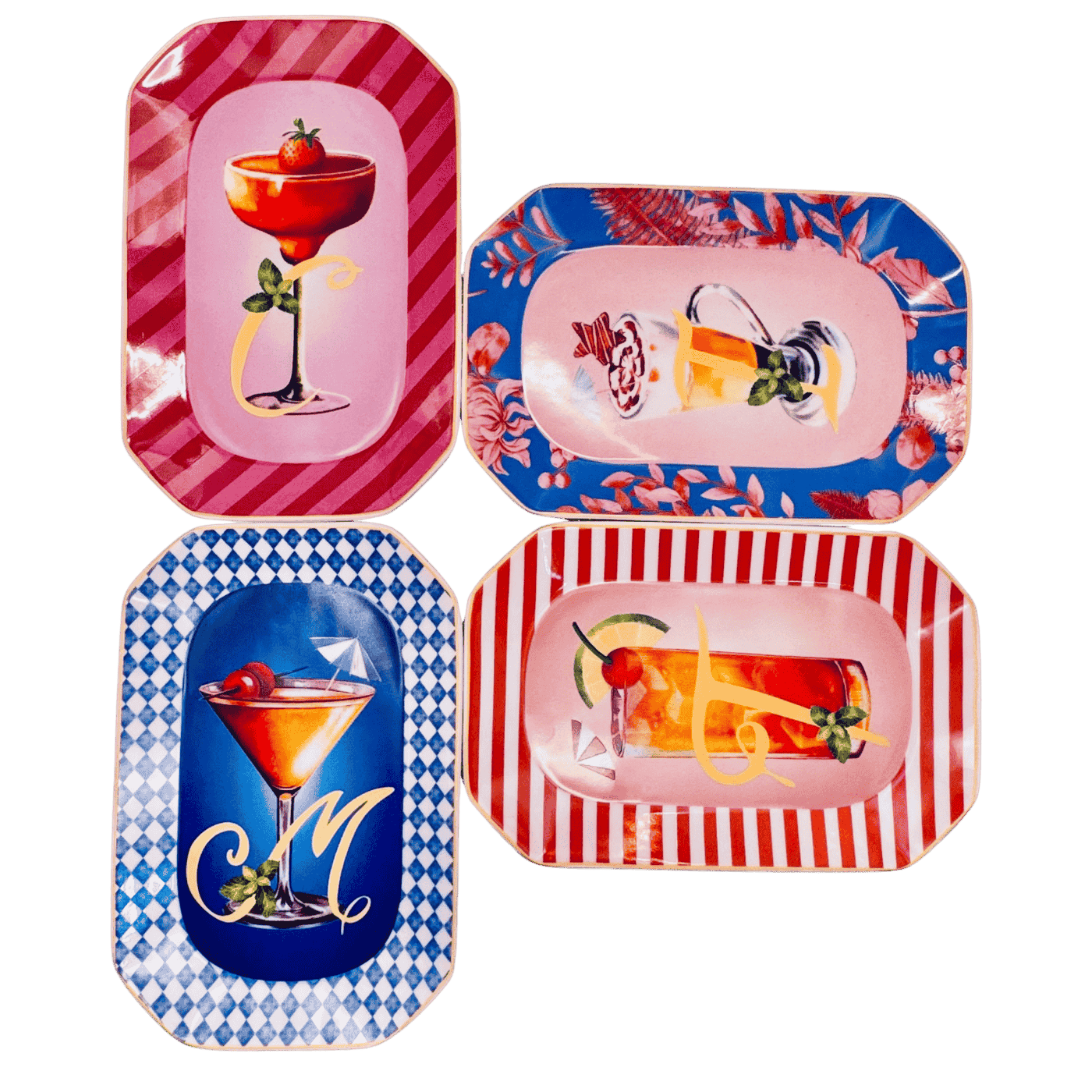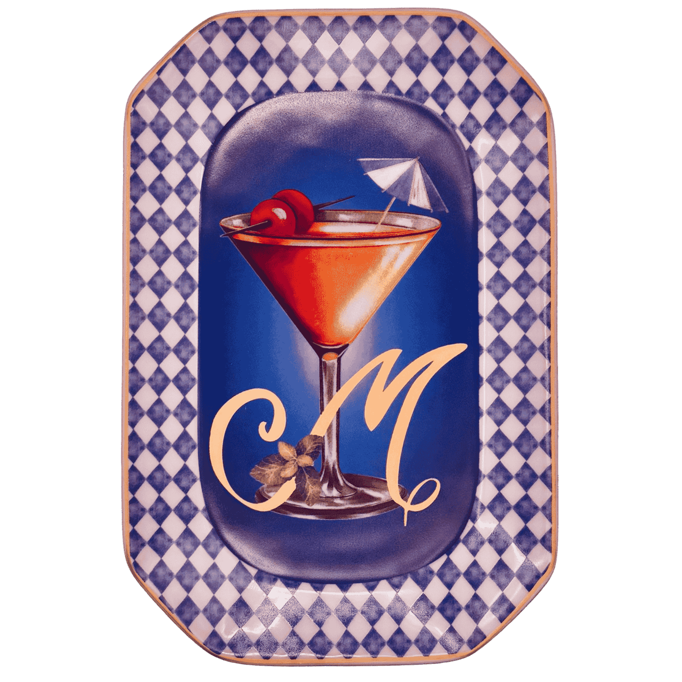 Vassoietto della linea “Happy Hour” con iniziale M, realizzato in porcellana. Sul lato frontale è stampata l’illustrazione di un cocktail, mentre sul retro è riportata la relativa ricetta, rendendolo un oggetto originale e decorativo.
