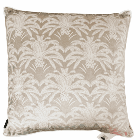Cuscino in velluto 50×50 “Pink Palms” con stampa di palme su fondo rosa e retro beige. Morbido e raffinato, dona un tocco tropicale agli interni. Ideale per letti o divani in stile boho o eclettico.