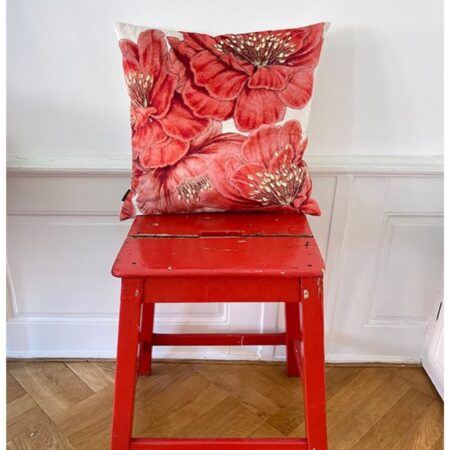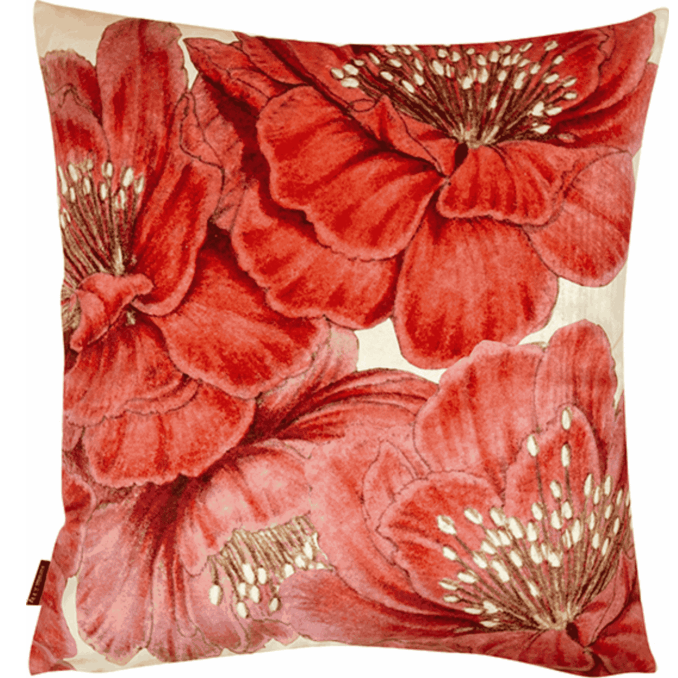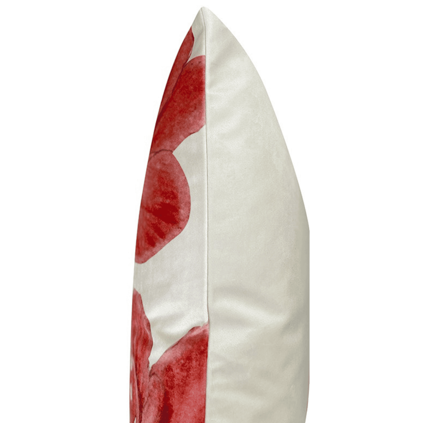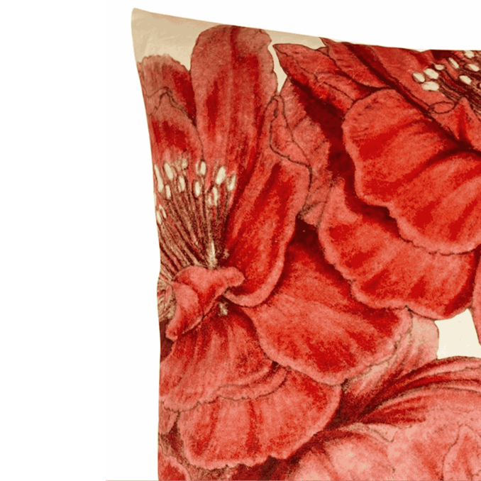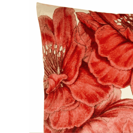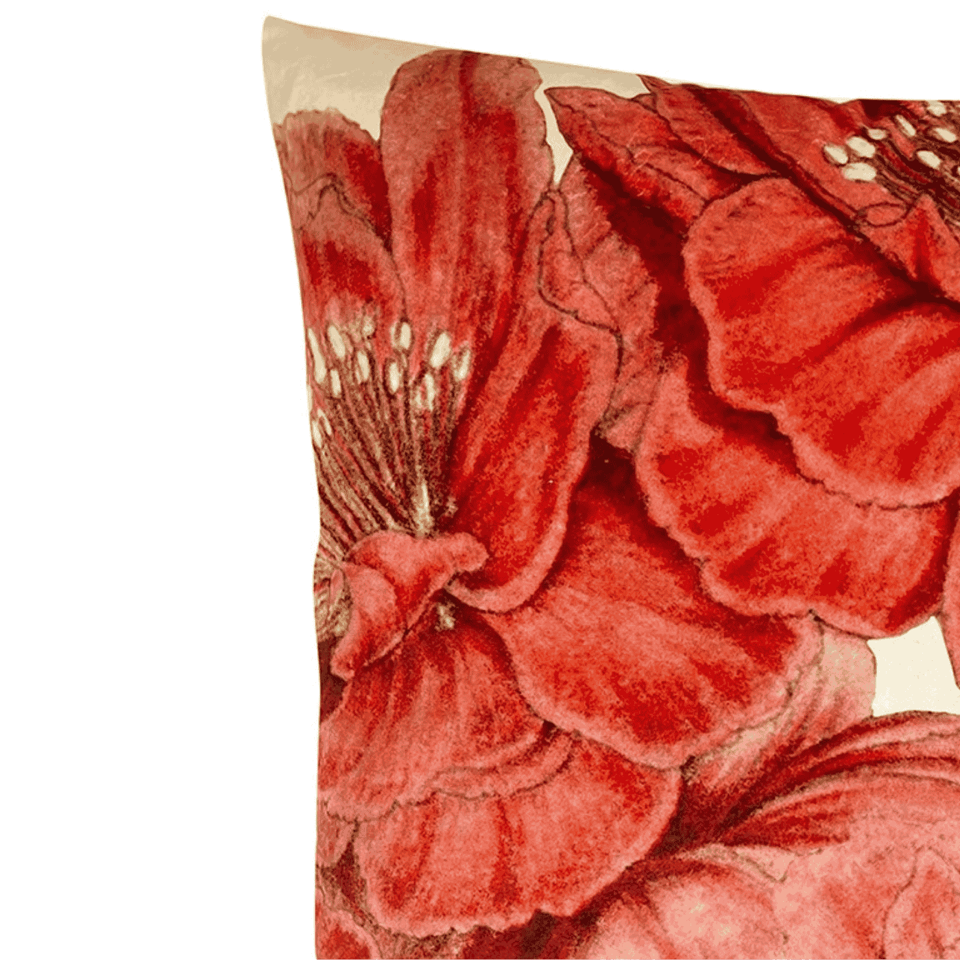 Cuscino in velluto 50×50 “Fiesta” con motivo floreale rosso e retro in velluto color avorio. Caldo e vivace, è perfetto per donare energia e stile agli ambienti giorno. Imbottitura inclusa.